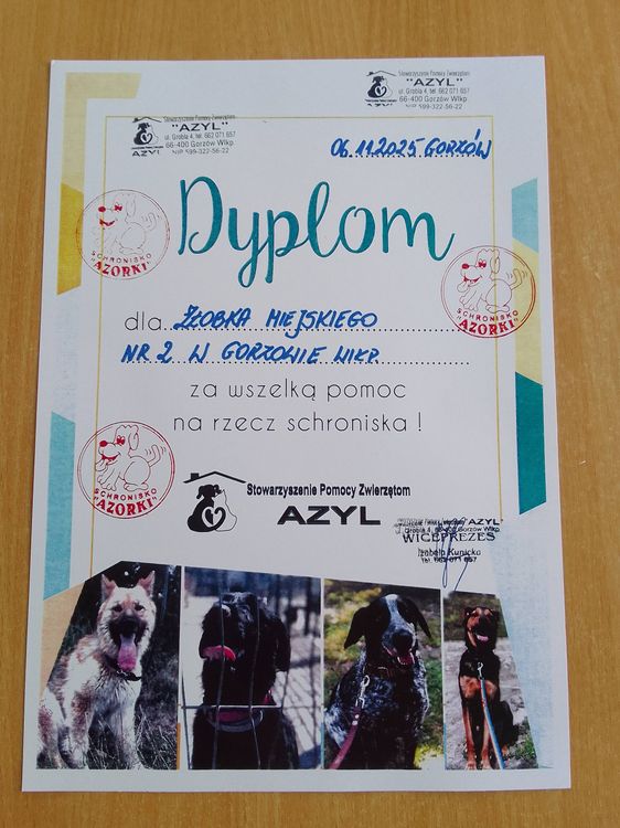 Cały październik w naszym żłobku trwała zbiórka karmy dla psów i kotów z gorzowskiego schroniska. Bardzo dziękujemy za zaangażowanie w akcję pomocy dla naszych bezdomnych czworonożnych  przyjaciół. Pracownicy schroniska wyrazili wdzięczność w imieniu zwierzaków i podarowali naszej placówce dyplom jako wyraz wdzięczności za smaczne podarki.