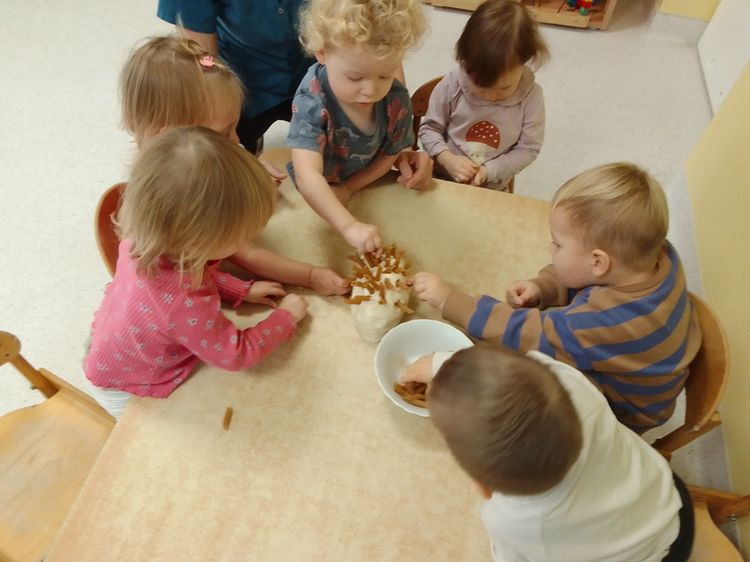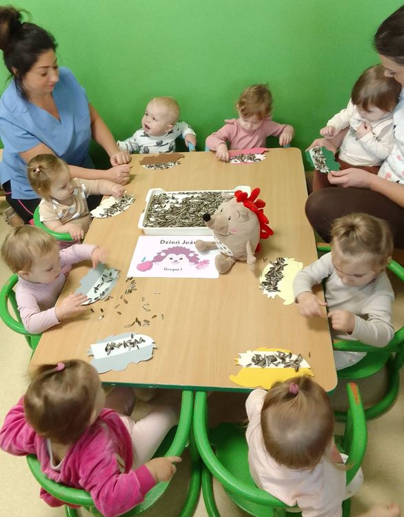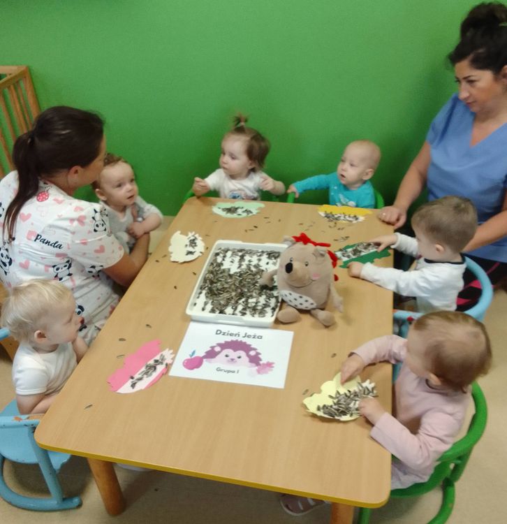 W miniony piątek obchodziliśmy dzień sympatycznego zwierzaczka- jeżyka. Nasze dzieciaczki mogły dowiedzieć się gdzie, co je i jak spędza zimę to kolczaste stworzenie. Żłobkowicze dekorowały jeże „igłami” ( z makaronu, nasion słonecznika i dyni). Nas podopieczni mogli poszukiwać i odkrywać zwierzaczki z kopca liści, a także dowiedzieć się, że są one bardzo nie tylko urocze, ale również bardzo pożyteczne. Dzień upłynął radośnie przy akompaniamencie wielu piosenek poświęconym jeżom.