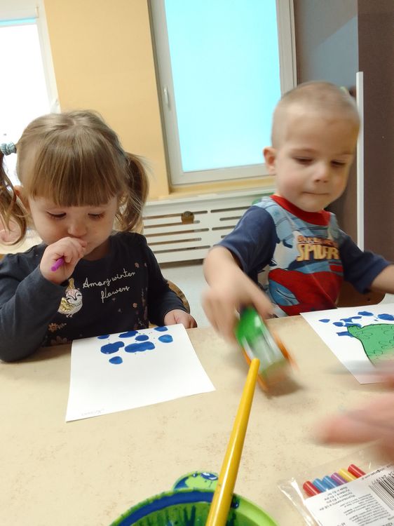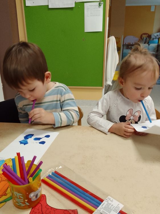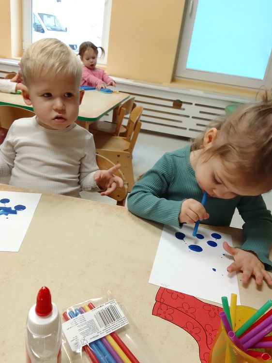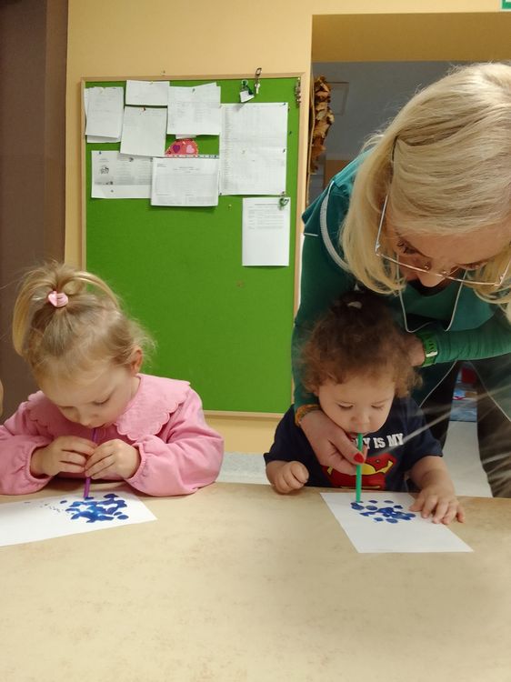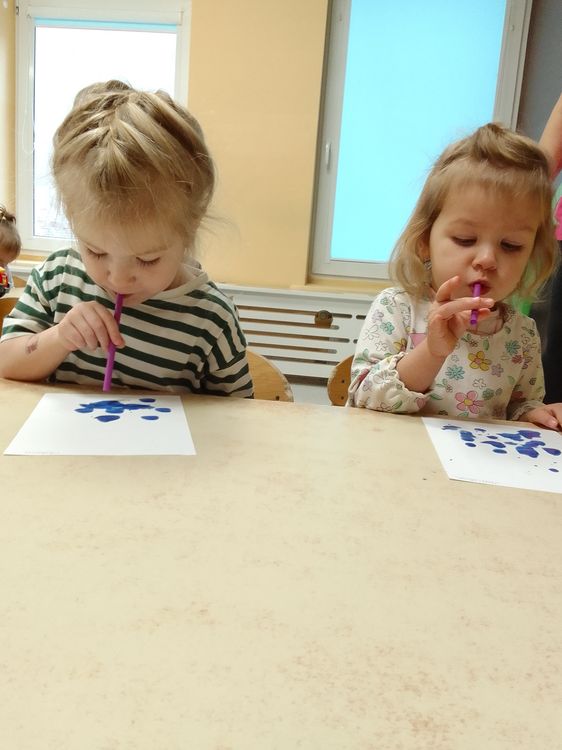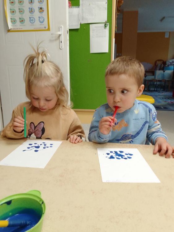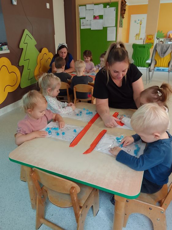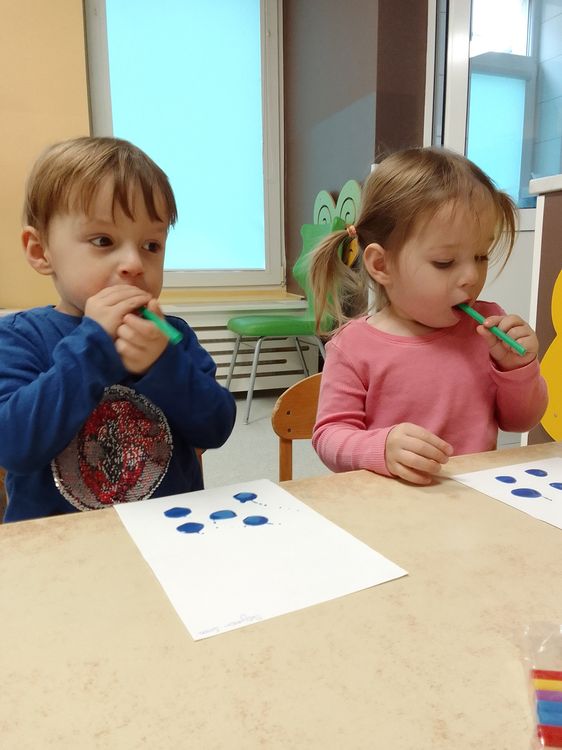 Wesołe Skrzaty w ubiegłym tygodniu poszerzały wiedzę na temat jesieni. Dzieci wiedza już, jakie zjawiska pogodowe są charakterystyczne dla jesieni, wykonały ciekawe sensoryczne zadanie „kropelka deszczu”. Zadaniem dzieci było przesuwanie palcem po woreczku tak, aby pomponik kropla trafił dokładnie na narysowaną kropelkę. Skrzaty wykonały również pracę plastyczną „Pluski plusk, chlapu, chlap w kaloszach do kałuży”. Za pomocą słomki ćwiczyły również oddech- rozdmuchiwały krople deszczu, z których powstała kałuża.