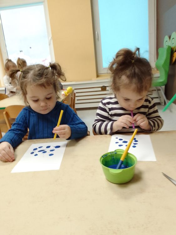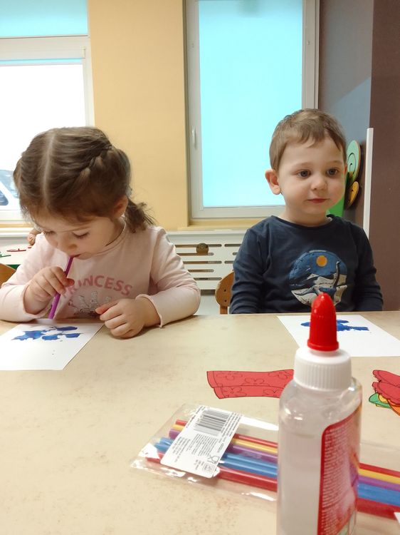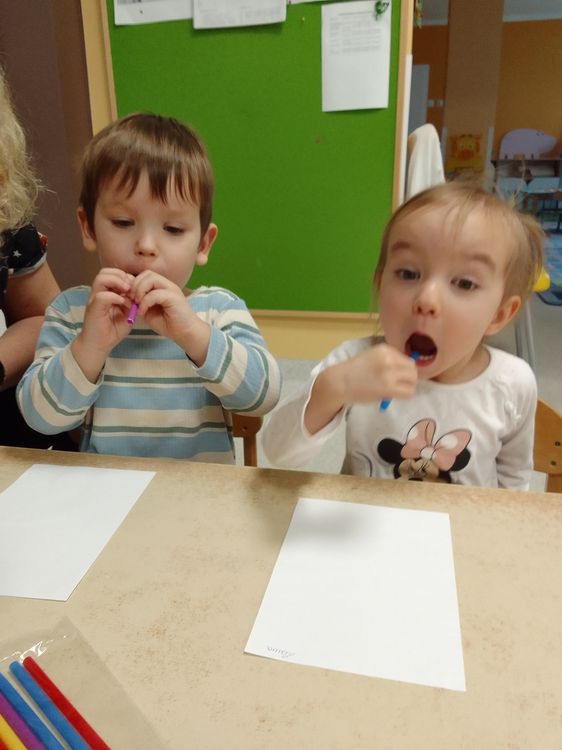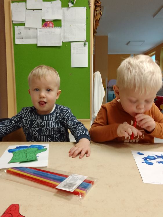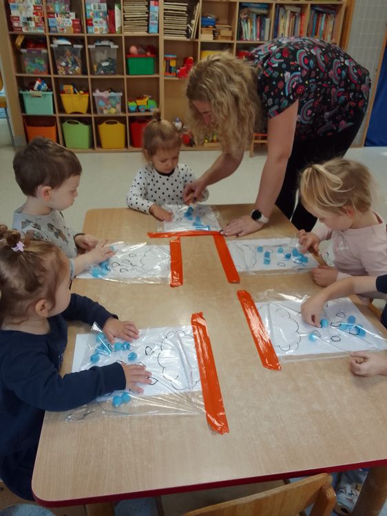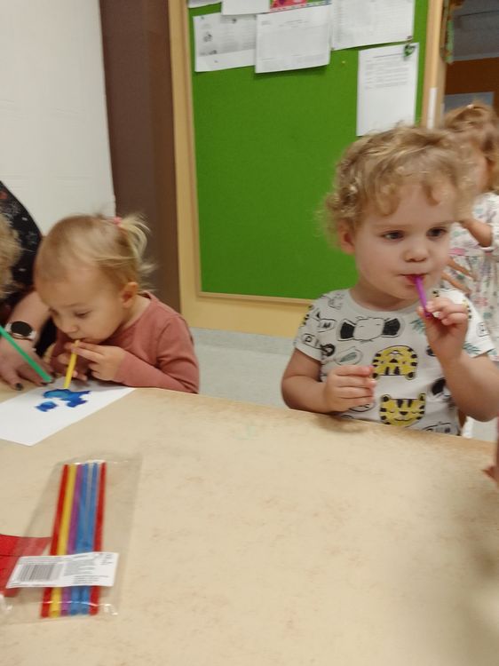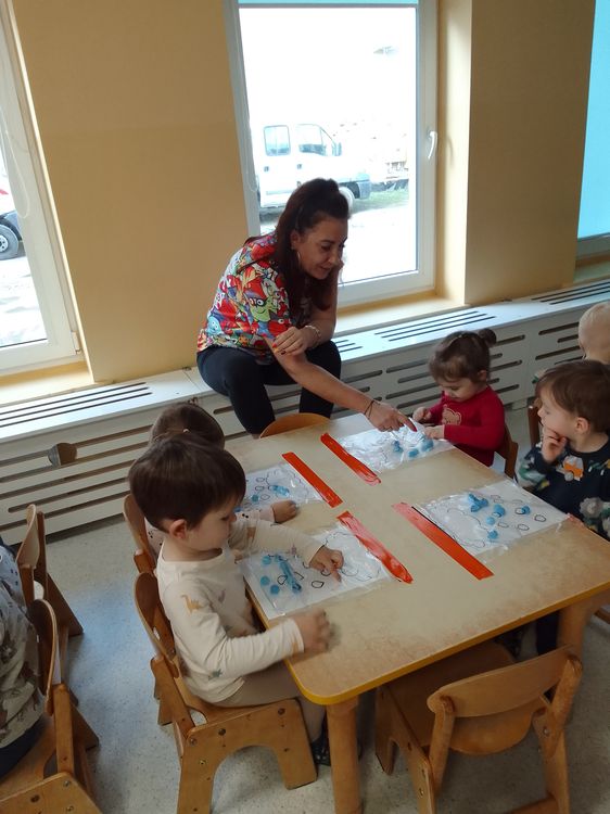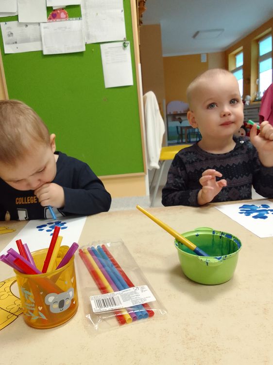 Wesołe Skrzaty w ubiegłym tygodniu poszerzały wiedzę na temat jesieni. Dzieci wiedza już, jakie zjawiska pogodowe są charakterystyczne dla jesieni, wykonały ciekawe sensoryczne zadanie „kropelka deszczu”. Zadaniem dzieci było przesuwanie palcem po woreczku tak, aby pomponik kropla trafił dokładnie na narysowaną kropelkę. Skrzaty wykonały również pracę plastyczną „Pluski plusk, chlapu, chlap w kaloszach do kałuży”. Za pomocą słomki ćwiczyły również oddech- rozdmuchiwały krople deszczu, z których powstała kałuża.