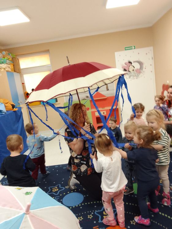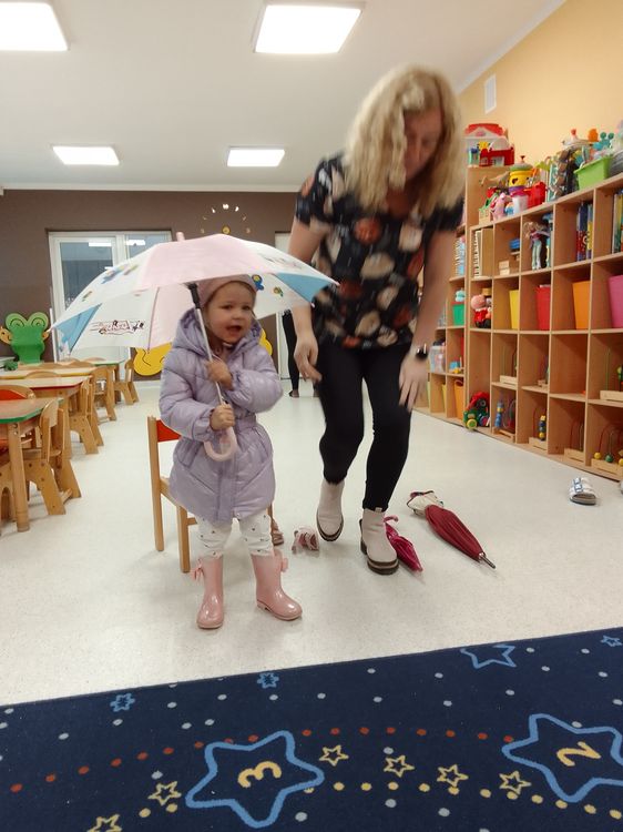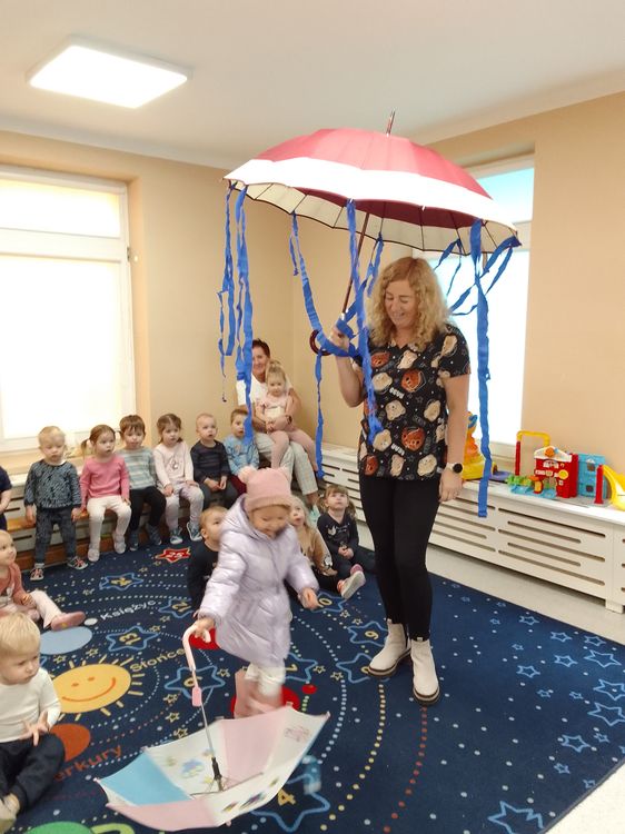 Skrzaty zatańczyły do piosenki „A ja noszę kalosze”, wiedzą jak odpowiednio się ubrać w deszczową pogodę. Zabawa taneczna z parasolem bardzo się dzieciom podobała.