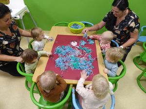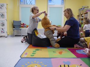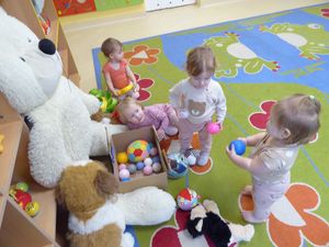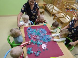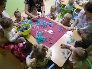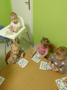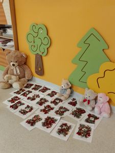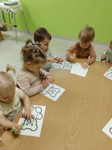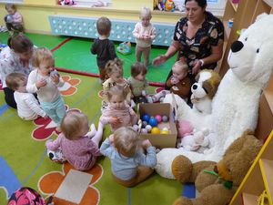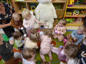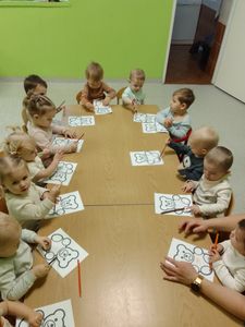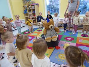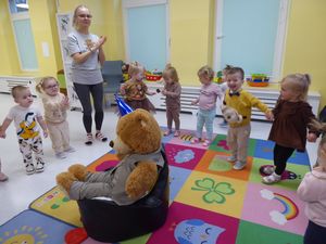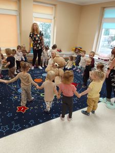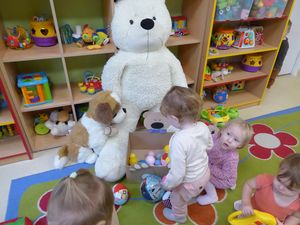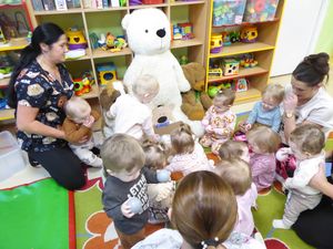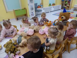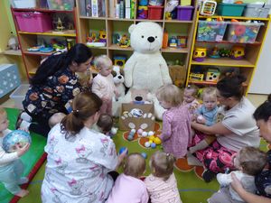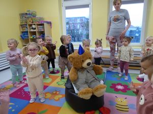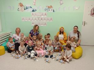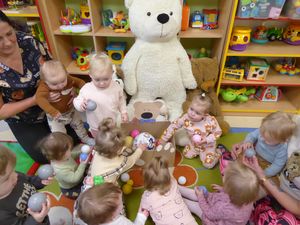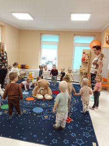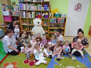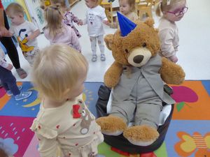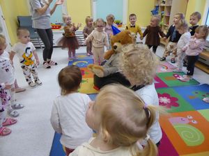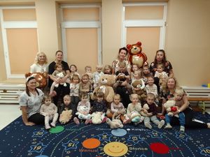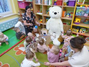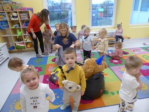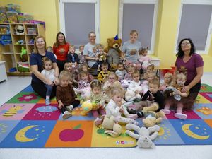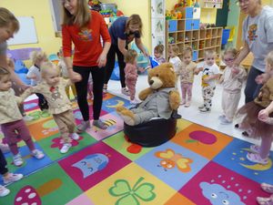 25.listopada obchodziliśmy święto przyjaciela i pocieszyciela wszystkich dzieci, pluszowego misia. Nasze dzieci brały udział w fantastycznych misiowych zabawach, w tym celowanie różnego rozmiaru piłeczkami do celu, który stanowił kartonowy niedźwiadek i misiowe, kolorowe prace plastyczne . Nie brakło tańców z misiem , a nawet ucztowania z elegancko ubranym, pluszakiem. Tradycyjnie każdy z naszych żłobkowiczków mógł przynieść swojego zabawkowego przyjaciela.