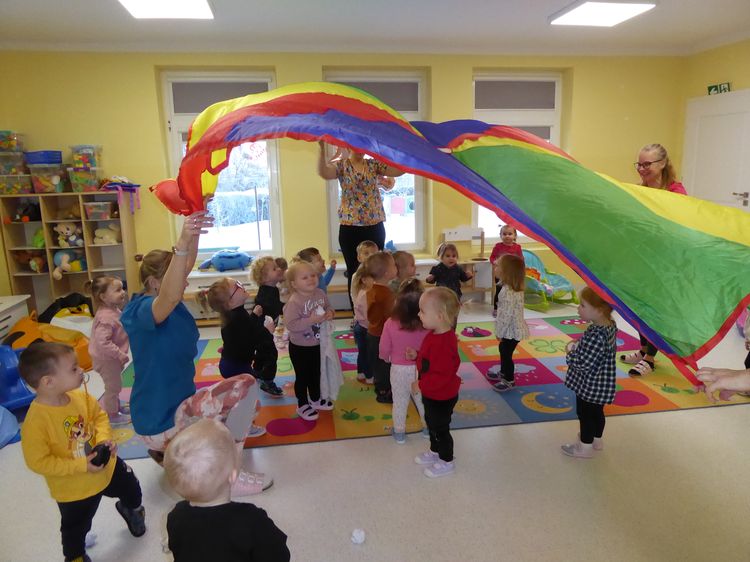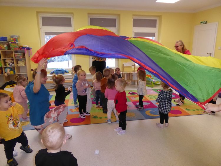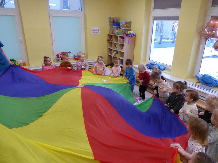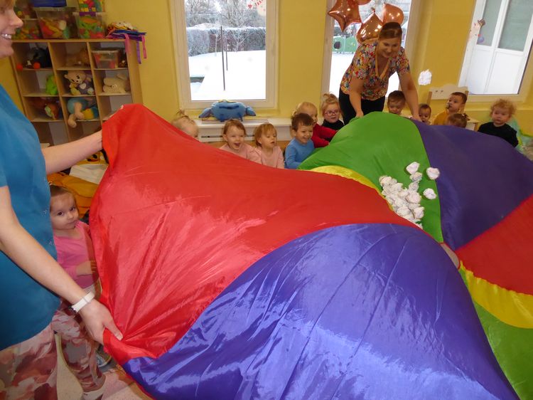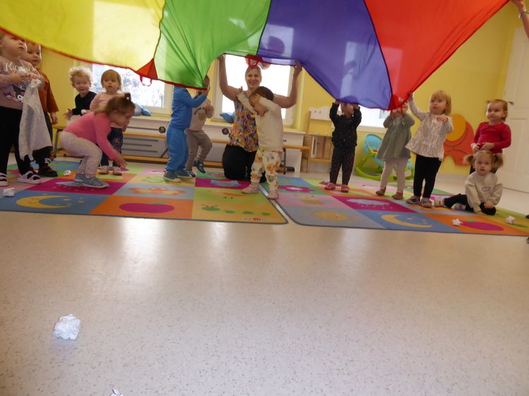 Podczas zabawy maluchy radośnie unosiły i opuszczały chustę, by śnieg zaczął tańczyć. Na zakończenie dzieci „posprzątały zimę” zbierając śnieżynki z podłogi.