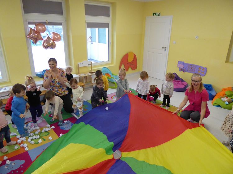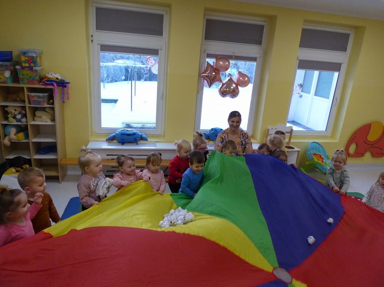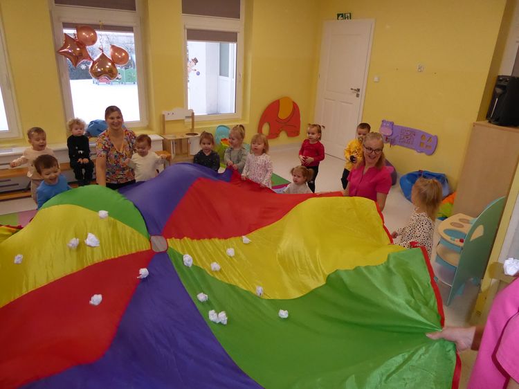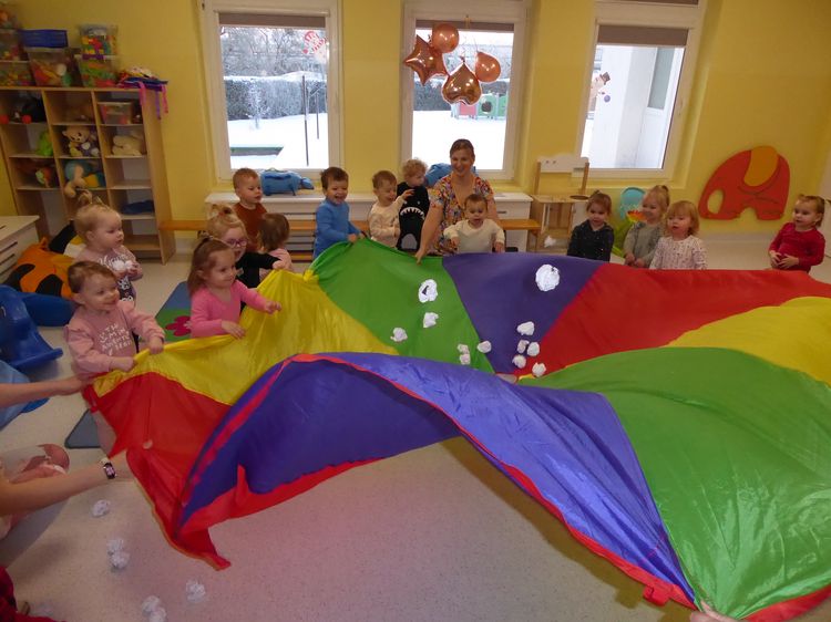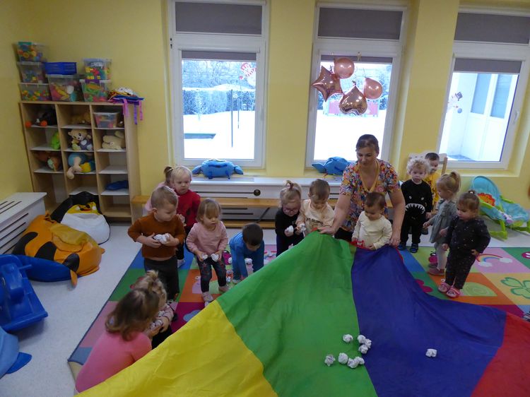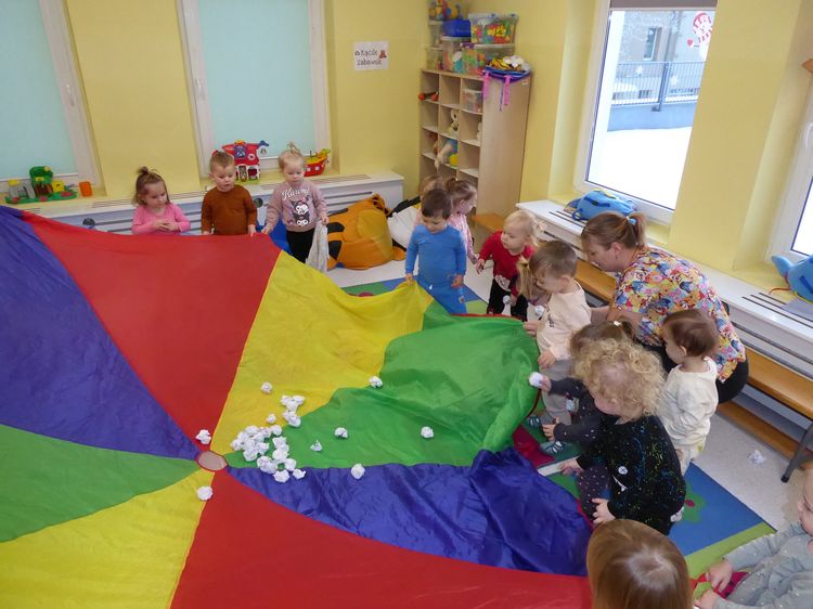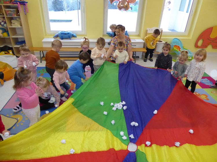 Radosne Misie uczestniczyły w „Śnieżnej burzy”. Zabawa z chustą Klanza i papierowymi śnieżkami rozwija koordynację ruchową, integruje grupę i stymuluje zmysły.