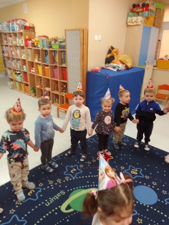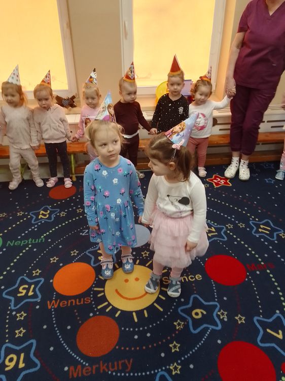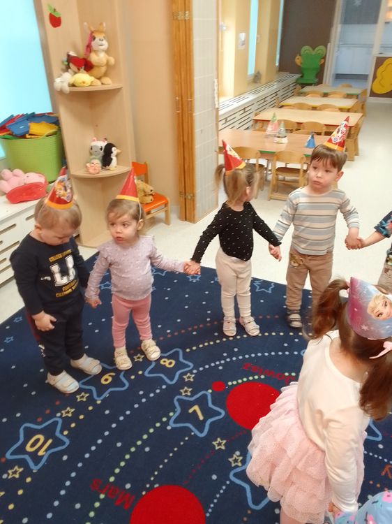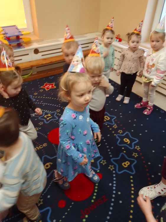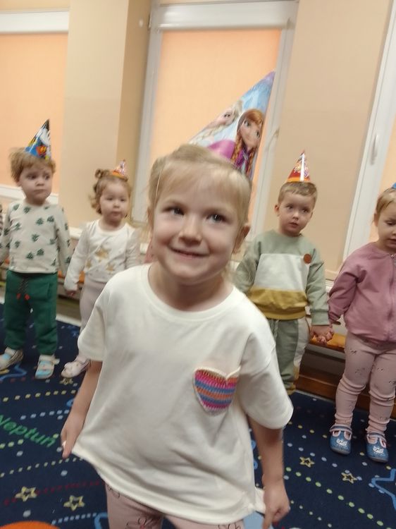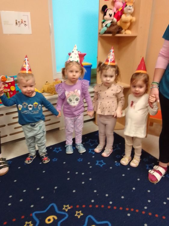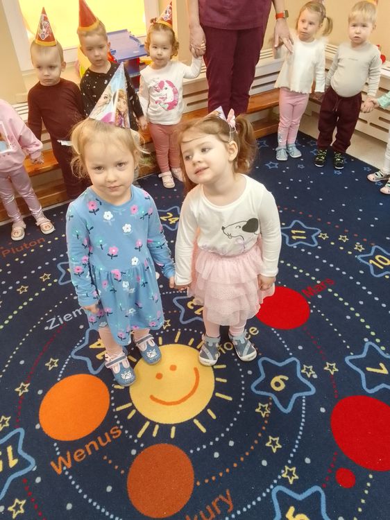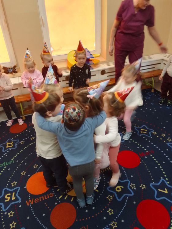 Aurelia, Emilka i Tosia. Dziewczynki przyniosły słodki poczęstunek, dzieci zaśpiewały „Sto lat” oraz taniec do muzyki disko. To była świetna uroczystość. Rodzicom dziękujemy za prezenciki i słodkości.