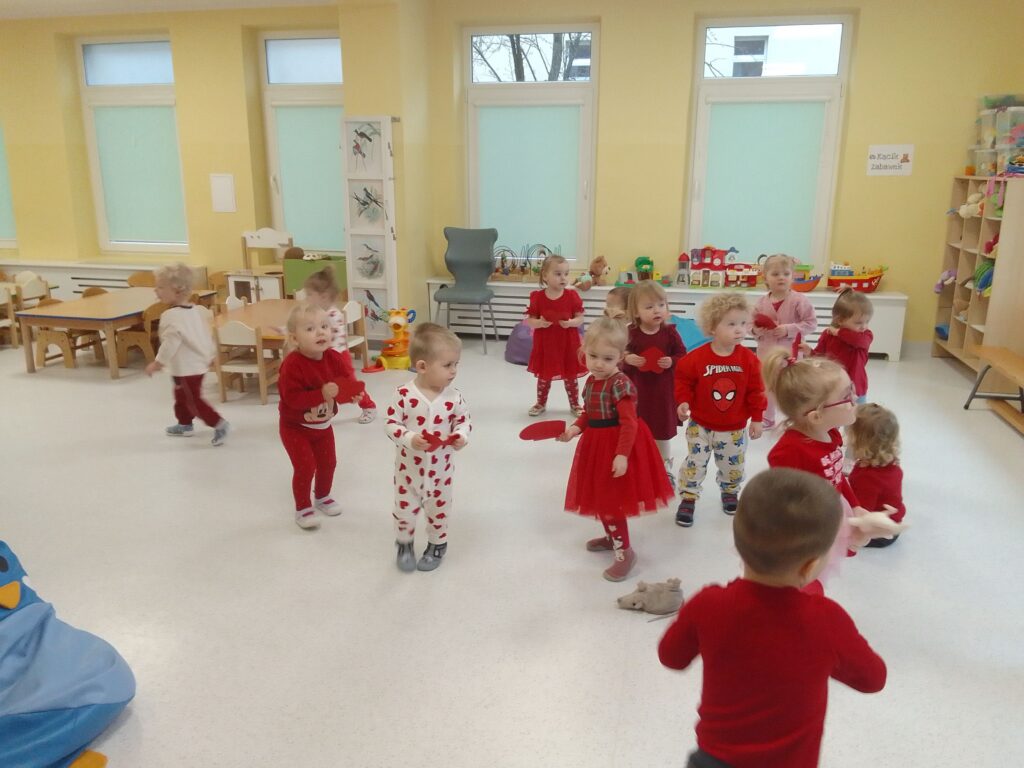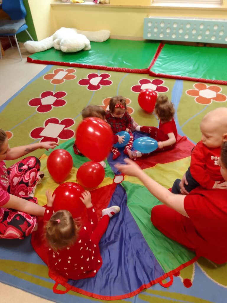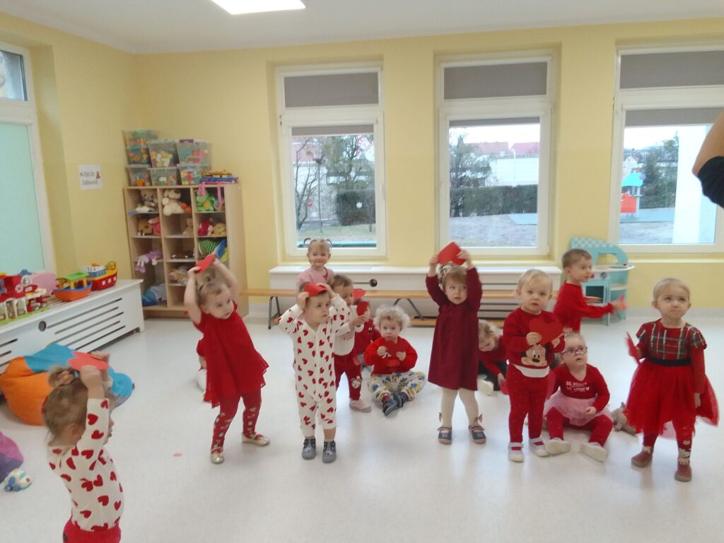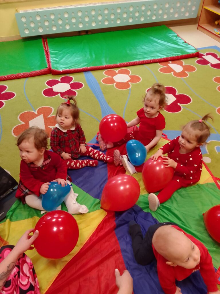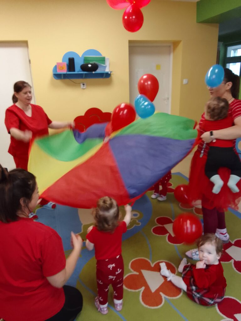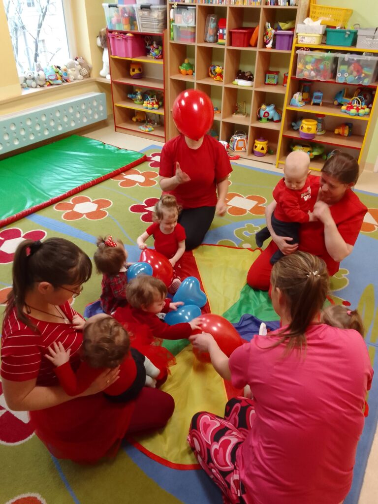 W miniony piątek w naszym żłobku zrobiło się bardzo miło i serdecznie. Powodem tego stały się Walentynki. Tego dnia wszyscy w czerwieni, bawili się pełni radości serduszkami o różnej wielkości i strukturze. Nie brakło tańców i zabaw z chustą Klauzego. Powstało wielkie serce z kulek, piękne serduszkowe wydzieranki i kolorowanki.
