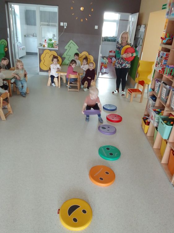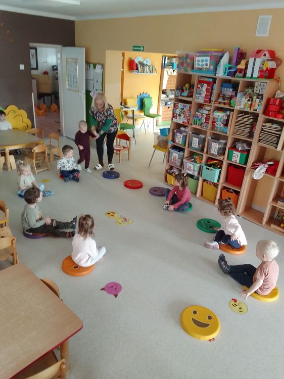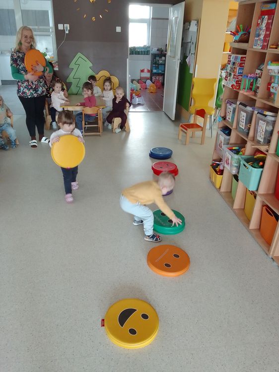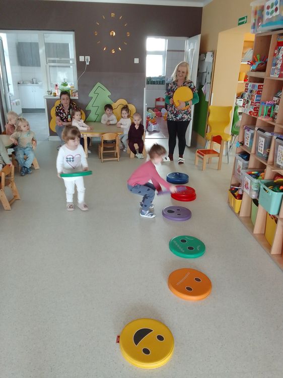 Dzieci siedzą w kole na dywanie i metodą lusterkową rozpoznają i naśladują daną emocję.